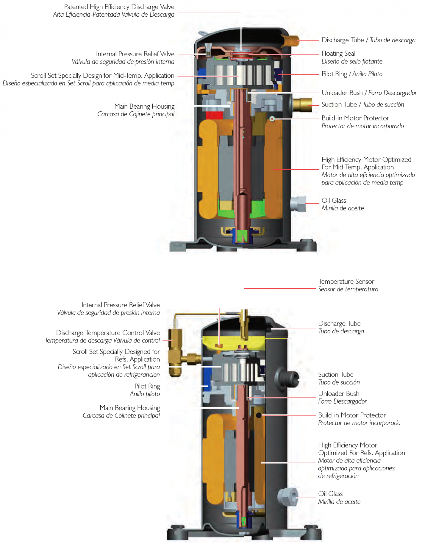 Scroll compressors with dual-compliance for mid. and lower temp. application YM / YF series